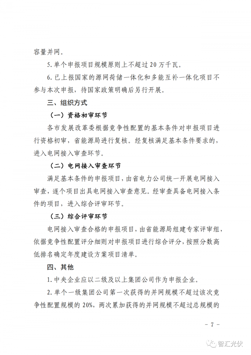 4)光伏項(xiàng)目:?jiǎn)蝹€(gè)申報(bào)項(xiàng)目規(guī)模原則上不超過(guò) 20 萬(wàn)千瓦。單個(gè)一級(jí)集團(tuán)公司第一次獲得的并網(wǎng)規(guī)模不超過(guò)該次競(jìng)爭(zhēng)性配置規(guī)模的 20%,兩次累加獲得的并網(wǎng)規(guī)模不超過(guò)總規(guī)模的20%。