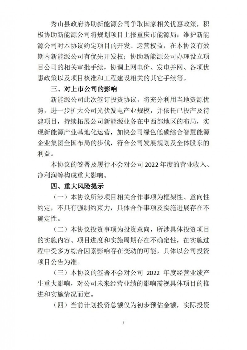 此次簽訂投資協(xié)議,新能源公司將充分利用當(dāng)?shù)刭Y源優(yōu)勢,進(jìn)一步擴(kuò)大公司光伏發(fā)電產(chǎn)業(yè)規(guī)模,并依托已投產(chǎn)及待建項(xiàng)目,持續(xù)拓展公司新能源業(yè)務(wù)在中西部地區(qū)的布局,實(shí)現(xiàn)新能源產(chǎn)業(yè)基地化運(yùn)營,加快公司綠色低碳綜合智慧能源企業(yè)集團(tuán)全國布局的步伐。