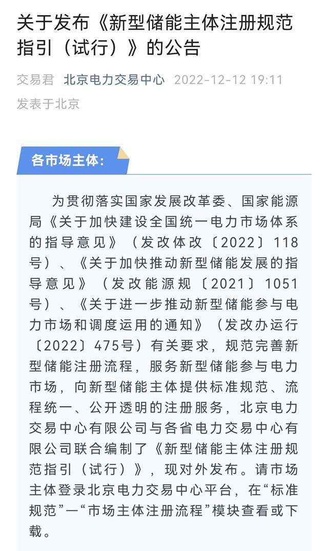 12日晚,北京市電力交易中心發(fā)布《新型儲能主體注冊規(guī)范指引(試行)》公告(下稱《指引》)。這是交易機構(gòu)首次從實施層面統(tǒng)一明確將新型儲能作為獨立于發(fā)電企業(yè)、售電公司和用戶的注冊類型,并且規(guī)范了詳細的注冊程序與所需信息、資料。