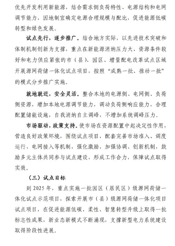 試點(diǎn)目標(biāo):到2025年,重點(diǎn)實(shí)施一批園區(qū)(居民區(qū))級源網(wǎng)荷儲一體化試點(diǎn)示范項(xiàng)目,探索開展市(縣)級源網(wǎng)荷儲一體化項(xiàng)目試點(diǎn)項(xiàng)目,在促進(jìn)能源低碳、柔性、智慧轉(zhuǎn)型升級上取得一批標(biāo)志性成果,新業(yè)態(tài)新模式不斷涌現(xiàn),支撐新型電力系統(tǒng)建設(shè)取得階段性進(jìn)展。