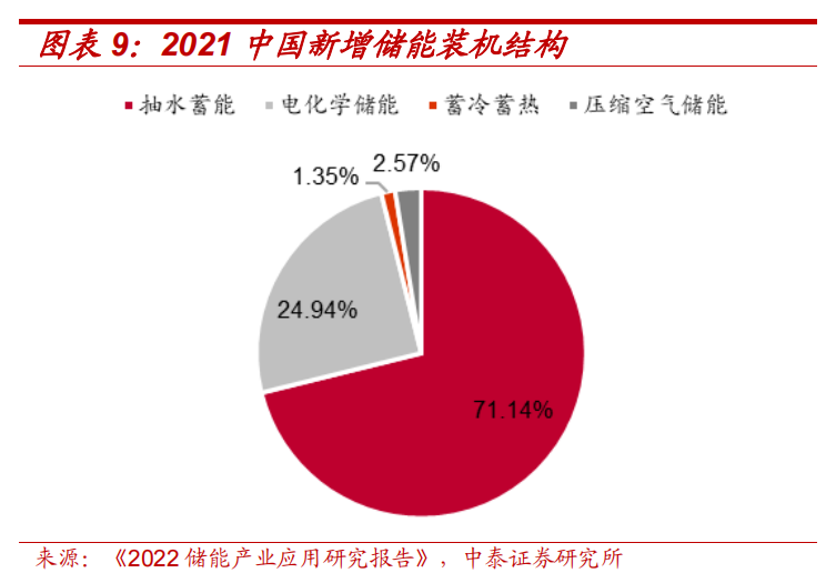 2021年中國抽水蓄能裝機功率38GW,占比全部儲能的86.52%,電化學(xué)儲能裝機功率5GW,占比11.78%,抽水蓄能是我國存量儲能的主要形式。2021年中國新增抽水蓄能裝機5GW,占比71.14%,電化學(xué)儲能新增2GW,占比24.94%,電化學(xué)儲能裝機增速超過抽水蓄能。抽水蓄能需要尋找合適地形及水域,同時可能涉及搬遷移民問題,外部限制因素較多,建設(shè)期通常長達(dá)數(shù)年。我國水電資源主要集中在南方地區(qū)尤其是西南地區(qū),西北等地區(qū)缺發(fā)建設(shè)大型抽蓄配套新能源的條件。而電化學(xué)儲能則對外界條件要求不高,建設(shè)期較短,單體投資小,因而成為新能源配儲的普遍選擇。