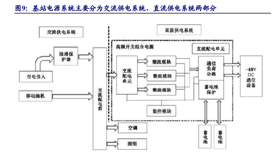 通信儲(chǔ)能作為通信基站的配套基礎(chǔ)設(shè)施,是保障通信系統(tǒng)實(shí)現(xiàn)可靠運(yùn)行的關(guān)鍵。 開(kāi)年以來(lái),北京、上海、深圳、寧夏、大連、吉林等省市宣布 5G 基站建設(shè)目標(biāo),1 月 31 日,北京宣布將在 2023 年新建 1 萬(wàn)個(gè)以上 5G 基站;2 月 8 日,寧夏宣布將在 2023 年新建 5G 基站 2000 個(gè),累計(jì)達(dá)到 13000 個(gè);2 月 11 日,上海計(jì)劃 2023 年新 建 1 萬(wàn)個(gè) 5G 基站;2 月 10 日,深圳市工信局發(fā)布《深圳市極速先鋒城市建設(shè)行動(dòng) 計(jì)劃》,計(jì)劃指出要全面提升 5G 網(wǎng)絡(luò)能效,全年新增 5G 基站 10000 個(gè)。2 月 13 日, 吉林省通信管理局公布 5G 基站相關(guān)數(shù)據(jù):2022 年建成 5G 基站 13042 個(gè),累計(jì)建成 5G 基站 34092 個(gè),并宣布了 2023 年目標(biāo):力爭(zhēng)新建 5G 基站 8000 個(gè)。2 月 14 日, 大連市通信管理局宣布全年全域?qū)⑿陆?5G 基站 4000 個(gè)以上,力爭(zhēng)年底建成 19000 個(gè) 5G 基站,重點(diǎn)場(chǎng)所網(wǎng)絡(luò)通達(dá)率提升至 99%。 我國(guó) 5G 基站的建設(shè)運(yùn)營(yíng)模式主要采用中國(guó)鐵塔建塔、引電建設(shè)基礎(chǔ)配套設(shè)施, 移動(dòng)、聯(lián)通、電信三大主運(yùn)營(yíng)商租塔、安裝設(shè)備并進(jìn)行網(wǎng)絡(luò)運(yùn)營(yíng)的模式,運(yùn)營(yíng)電費(fèi) 由鐵塔代運(yùn)營(yíng)商統(tǒng)一向電力部門(mén)繳納。5G 基站開(kāi)通后電費(fèi)成本開(kāi)支已高于鐵塔租費(fèi), 較大的 5G 基站耗電量已經(jīng)成為阻礙 5G 和制約行業(yè)發(fā)展的一個(gè)重要因素。利用儲(chǔ)能 裝置在負(fù)荷高峰時(shí)期放電,負(fù)荷低谷時(shí)期從電網(wǎng)充電,減少高峰負(fù)荷需求,節(jié)省用電費(fèi)用,從而達(dá)到改善負(fù)荷特性、參與系統(tǒng)調(diào)峰的目的,同時(shí)節(jié)省電費(fèi)、最大限度 套利。 基站電源系統(tǒng)主要分為交流供電系統(tǒng)、直流供電系統(tǒng)兩部分。交流供電系統(tǒng)包 含市電引入、移動(dòng)油機(jī)、浪涌保護(hù)器、交流配電箱等。直流供電系統(tǒng)包含高頻開(kāi)關(guān) 組合電源,蓄電池等。