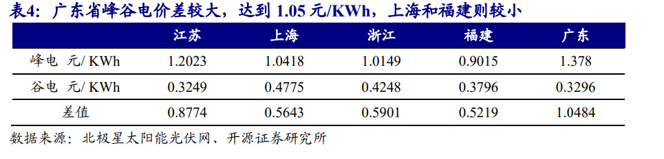 目前儲(chǔ)能站盈利模式的其中一類(lèi)是采取峰谷電價(jià)套利模式,即儲(chǔ)能站在谷時(shí)充 電,峰時(shí)放電,以此補(bǔ)平電網(wǎng)負(fù)荷曲線的同時(shí)獲取峰谷電價(jià)差值的收益。 參考 2023 年各省電網(wǎng)企業(yè)代理購(gòu)電價(jià)格來(lái)看,江蘇、上海、浙江、福建、廣東 等省為代表性較強(qiáng)的省份,選取谷時(shí)和高峰時(shí)段電價(jià)進(jìn)行比較,上海和福建的峰谷 電價(jià)差值較小,僅為 0.56 元、0.52 元/KWh,而廣東則價(jià)差較大,達(dá)到 1.05 元/KWh。