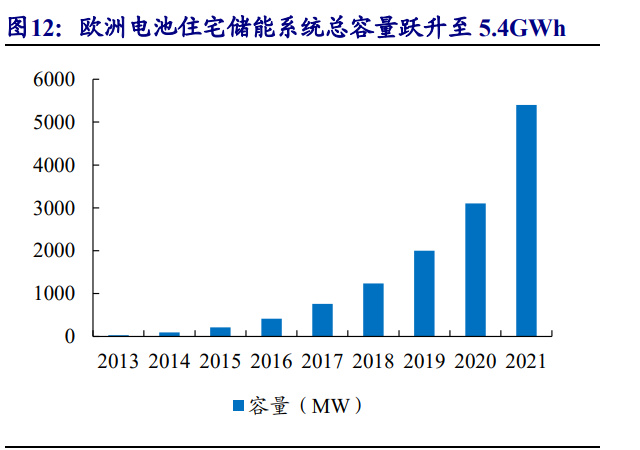 歐洲光伏產(chǎn)業(yè)協(xié)會(huì)(SolarPower Europe)數(shù)據(jù)表明,歐洲部署的住宅儲(chǔ)能系統(tǒng)總儲(chǔ)能容量在 2020 年首次突破 1GWh,而在 2021 年又增長(zhǎng)了一倍多,達(dá)到 2.3GWh。 2021 年住宅電池儲(chǔ)能市場(chǎng)的規(guī)模是 2014 年的 35 倍。歐盟各國(guó)在 2014 年僅安裝了約 9000 套住宅電池儲(chǔ)能系統(tǒng),而到 2021 年,約部署了 26 萬(wàn)套住宅電池儲(chǔ)能系統(tǒng)。歐 洲光伏產(chǎn)業(yè)協(xié)會(huì)在其“中等情景”預(yù)計(jì) 2022 年將達(dá)到 3.9GWh,將增長(zhǎng) 71%,這將 使歐洲累計(jì)部署的住宅儲(chǔ)能系統(tǒng)總儲(chǔ)能容量達(dá)到 9.3GWh。根據(jù)該協(xié)會(huì)的預(yù)計(jì),歐洲 在 2022 年將安裝 42 萬(wàn)多塊蓄電池,這將使歐洲 100 多萬(wàn)戶(hù)家庭使用住宅太陽(yáng)能發(fā) 電設(shè)施和住宅電池儲(chǔ)能系統(tǒng)。歐洲電池儲(chǔ)能系統(tǒng)的電池通常是進(jìn)口的,現(xiàn)在面臨著 嚴(yán)重短缺的困境。 歐洲光伏產(chǎn)業(yè)協(xié)會(huì)認(rèn)為,住宅太陽(yáng)能和儲(chǔ)能系統(tǒng)的部署熱潮將會(huì)持續(xù)下去。根 據(jù)該協(xié)會(huì)對(duì)“中等情景”的預(yù)計(jì),到 2026 年底,歐洲將有 390 萬(wàn)戶(hù)家庭部署住宅電 池儲(chǔ)能系統(tǒng),累計(jì)部署的儲(chǔ)能容量將增長(zhǎng) 300%以上,達(dá)到 32.2GWh。而其“高等情 景”預(yù)測(cè)超過(guò) 44GWh。德國(guó)是在歐洲領(lǐng)先的住宅電池儲(chǔ)能市場(chǎng) (2021 年占?xì)W洲住宅 電池儲(chǔ)能市場(chǎng)份額的 59%),新建的住宅太陽(yáng)能設(shè)施的電池儲(chǔ)能系統(tǒng)配套部署率達(dá)到 70%,并且還在進(jìn)一步上升。