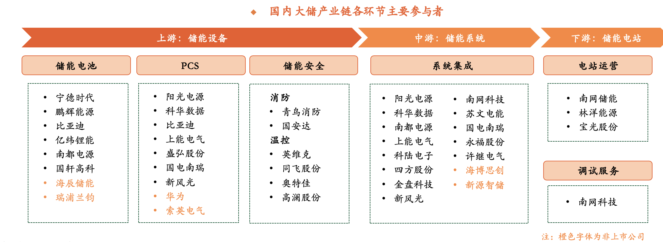 大儲產(chǎn)業(yè)鏈主要包括上游儲能設(shè)備、中游系統(tǒng)集成、下游電站等環(huán)節(jié)。儲能電池和PCS是大儲產(chǎn)業(yè)鏈價值量最大的兩個環(huán)節(jié),陳驍?shù)热苏J(rèn)為,儲能電池絕對龍頭寧德時代,第二梯隊比亞迪、鵬輝能源、億緯鋰能、國軒高科、南都電源、海辰儲能等有望借國內(nèi)大儲市場加速贏得動力電池之外的第二成長曲線。國內(nèi)大儲PCS頭部企業(yè)陽光電源、科華數(shù)據(jù)、上能電氣、盛弘股份、國電南瑞、新風(fēng)光等在裝機(jī)提速+毛利改善下業(yè)績有望受益。