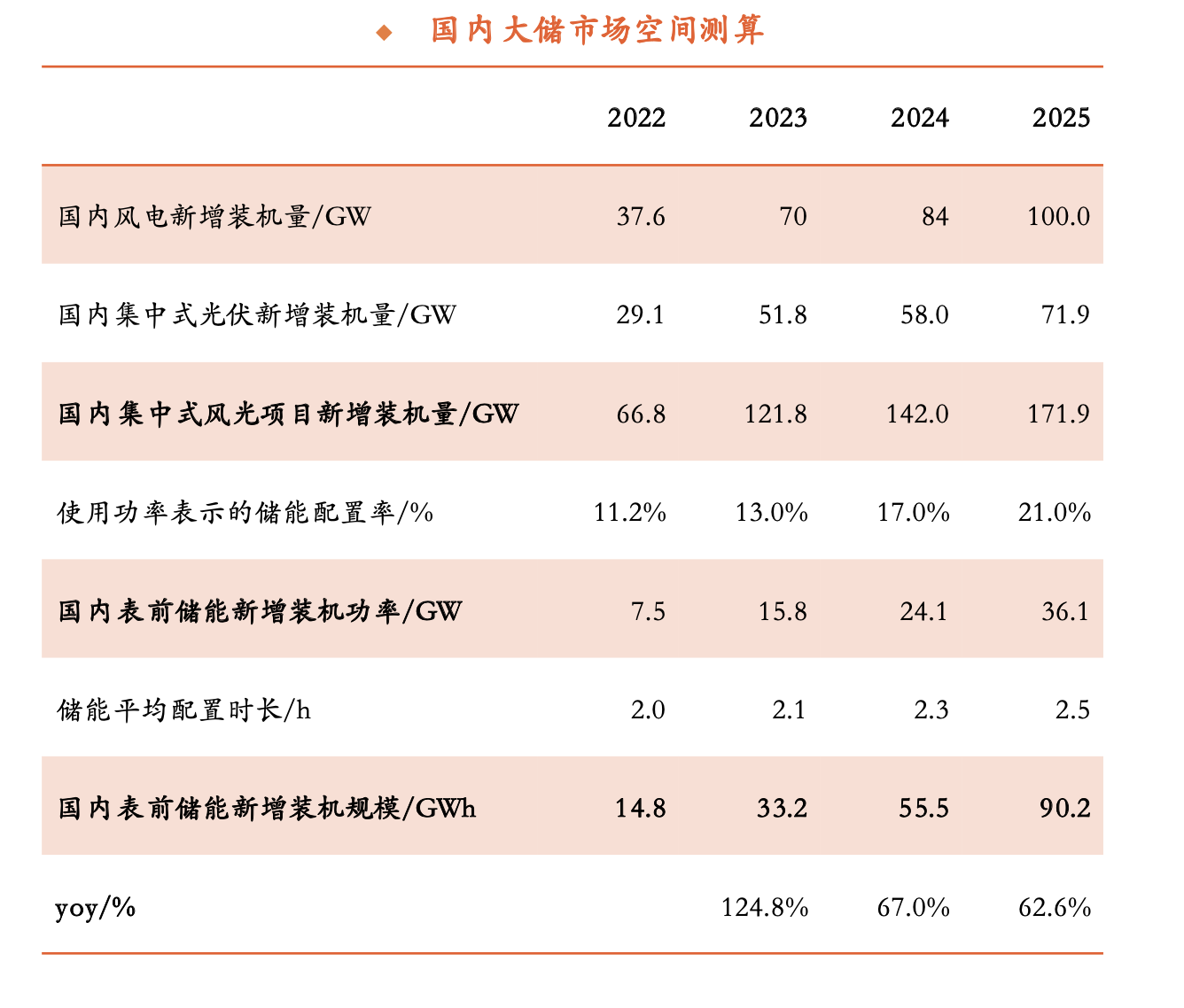 根據(jù)平安證券測算,假設(shè)2023/2024/2025年儲能配置率分別為13%/17%/21%,時長分別為2.1h/2.3h/2.5h。今年國內(nèi)大儲新增裝機(jī)有望達(dá)到33.2GWh,同比增長124.8%;到2025年,國內(nèi)大儲新增裝機(jī)量有望進(jìn)一步增長至90.2GWh,2022-2025年復(fù)合增長率達(dá)83%。