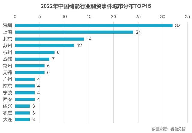 根據(jù)睿獸分析統(tǒng)計(jì),2022年中國(guó)儲(chǔ)能行業(yè)融資事件遍布全國(guó)20余個(gè)省份,其中廣東、江蘇、上海三地領(lǐng)先,三省融資事件數(shù)量合計(jì)占比50.53%。從城市分布來看,深圳、上海、北京、蘇州、杭州位居全國(guó)前五位,合計(jì)占比達(dá)47.87%。