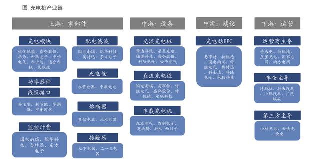 再來拆下充電樁的產(chǎn)業(yè)鏈,充電樁的產(chǎn)業(yè)鏈很簡單,上游是零部件、中游是設備加工制造,再到下游運營環(huán)節(jié)。