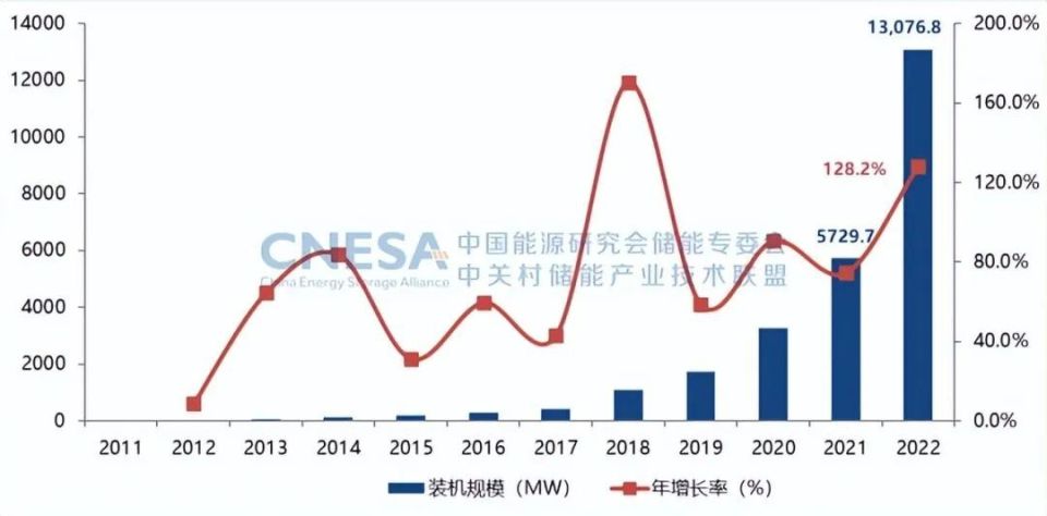 圖表 10:2020-2022年中國(guó)新型儲(chǔ)能市場(chǎng)累計(jì)裝機(jī)規(guī)?!挝唬篗W,%