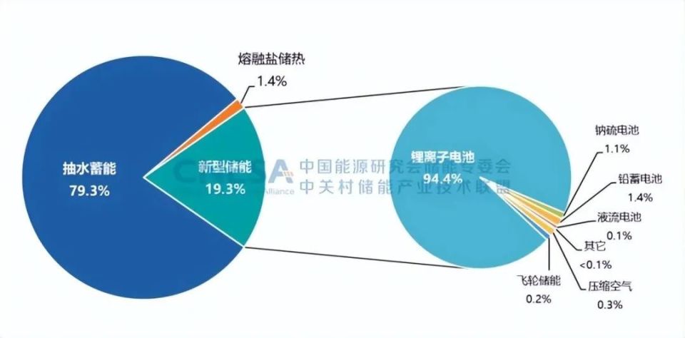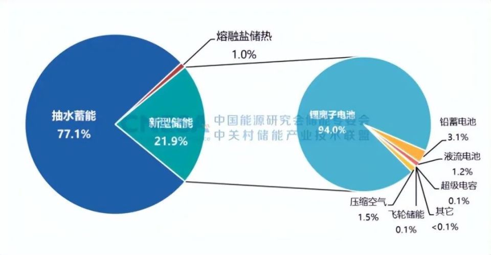 2022年,中國(guó)新增投運(yùn)電力儲(chǔ)能項(xiàng)目裝機(jī)規(guī)模首次突破15GW,達(dá)到16.5GW,其中,抽水蓄能新增規(guī)模9.1GW,同比增長(zhǎng)75%;新型儲(chǔ)能新增規(guī)模創(chuàng)歷史新高,達(dá)到7.3GW/15.9GWh,功率規(guī)模同比增長(zhǎng)200%,能量規(guī)模同比增長(zhǎng)280%;新型儲(chǔ)能中,鋰離子電池占據(jù)絕對(duì)主導(dǎo)地位,比重達(dá)97%,此外,壓縮空氣儲(chǔ)能、液流電池、鈉離子電池、飛輪等其它技術(shù)路線的項(xiàng)目,在規(guī)模上有所突破,應(yīng)用模式逐漸增多。