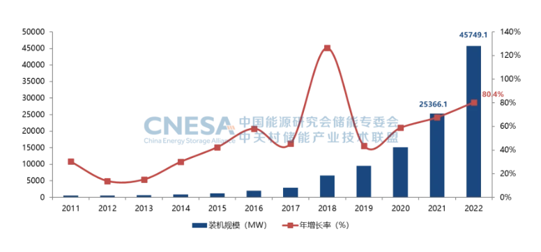根據(jù)CNESA全球儲(chǔ)能項(xiàng)目庫(kù)的不完全統(tǒng)計(jì),截至2022年底,中國(guó)已投運(yùn)電力儲(chǔ)能項(xiàng)目累計(jì)裝機(jī)規(guī)模59.8GW,占全球市場(chǎng)總規(guī)模的25%,年增長(zhǎng)率38%。抽水蓄能累計(jì)裝機(jī)占比同樣首次低于80%,與2021年同期相比下降8.3個(gè)百分點(diǎn);新型儲(chǔ)能繼續(xù)高速發(fā)展,累計(jì)裝機(jī)規(guī)模首次突破10GW,達(dá)到13.1GW/27.1GWh,功率規(guī)模年增長(zhǎng)率達(dá)128%,能量規(guī)模年增長(zhǎng)率達(dá)141%。
