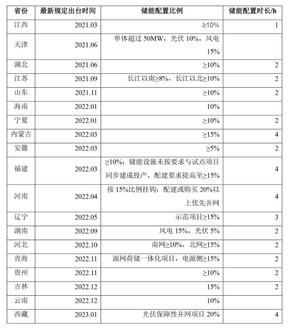 為響應(yīng)上述國(guó)家政策的號(hào)召,在地方層面,已有多地有關(guān)部門(mén)因地制宜地推出了新能源項(xiàng)目(主要為風(fēng)電、光伏電站)的強(qiáng)制配儲(chǔ)政策,部分列示如下: