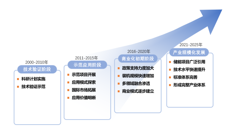 我國(guó)儲(chǔ)能市場(chǎng)大致可分為四個(gè)發(fā)展階段:一是技術(shù)驗(yàn)證階段(2010年以前),主要是開(kāi)展基礎(chǔ)研發(fā)和技術(shù)驗(yàn)證示范;二是示范應(yīng)用階段(2011~2015年),通過(guò)示范項(xiàng)目開(kāi)展,儲(chǔ)能技術(shù)性能快速提升、應(yīng)用模式不斷清晰,應(yīng)用價(jià)值被廣泛認(rèn)可,這個(gè)時(shí)期的儲(chǔ)能裝機(jī)以傳統(tǒng)的抽水蓄能為主;三是商業(yè)化初期(2016~2020年),隨著政策支持力度加大、市場(chǎng)機(jī)制逐漸理順、多領(lǐng)域融合滲透,儲(chǔ)能裝機(jī)規(guī)模快速增加、商業(yè)模式逐漸建立;四是產(chǎn)業(yè)規(guī)?;l(fā)展階段(2021~2025年),儲(chǔ)能產(chǎn)業(yè)進(jìn)入從產(chǎn)業(yè)化初期向規(guī)?;l(fā)展的過(guò)渡階段,隨著國(guó)家“雙碳”政策提出,儲(chǔ)能規(guī)模獲得了快速增長(zhǎng),儲(chǔ)能項(xiàng)目廣泛應(yīng)用、技術(shù)水平快速提升、標(biāo)準(zhǔn)體系日趨完善,形成較為完整的產(chǎn)業(yè)體系和一批有國(guó)際競(jìng)爭(zhēng)力的市場(chǎng)主體,儲(chǔ)能成為能源領(lǐng)域經(jīng)濟(jì)新增長(zhǎng)點(diǎn)。2022年2月,國(guó)家發(fā)展改革委、國(guó)家能源局印發(fā)的《“十四五”新型儲(chǔ)能發(fā)展實(shí)施方案》(以下簡(jiǎn)稱(chēng)“《實(shí)施方案》”)提出,到2025年,新型儲(chǔ)能由商業(yè)化初期步入規(guī)?;l(fā)展階段,具備大規(guī)模商業(yè)化應(yīng)用條件,有望2030年前后實(shí)現(xiàn)全面市場(chǎng)化。其中,新型儲(chǔ)能是指除抽水蓄能以外的新型儲(chǔ)能技術(shù),包括新型鋰離子電池、液流電池、飛輪、壓縮空氣、氫(氨)儲(chǔ)能、熱(冷)儲(chǔ)能等。