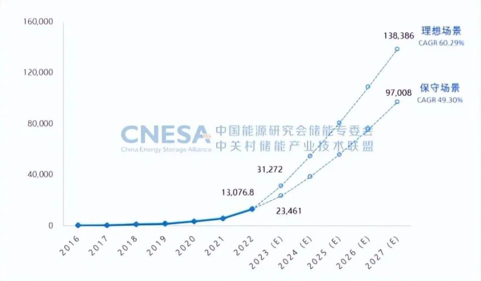 經(jīng)歷“十三五”孕育,“十四五”時(shí)期,我國(guó)新型儲(chǔ)能市場(chǎng)有望邁上新臺(tái)階。2021開(kāi)始,我國(guó)新型儲(chǔ)能從商業(yè)化初期向規(guī)?;l(fā)展,根據(jù)CNESA預(yù)測(cè),在未來(lái)5年,“新能源+儲(chǔ)能”是新型儲(chǔ)能的主要應(yīng)用場(chǎng)景,政策推動(dòng)將構(gòu)成中國(guó)儲(chǔ)能市場(chǎng)的主要增長(zhǎng)動(dòng)力;根據(jù)中國(guó)能源研究會(huì)儲(chǔ)能專(zhuān)委會(huì)/中關(guān)村儲(chǔ)能產(chǎn)業(yè)技術(shù)聯(lián)盟(CNESA)全球儲(chǔ)能數(shù)據(jù)庫(kù)的不完全統(tǒng)計(jì),截至2022年底,國(guó)內(nèi)已投運(yùn)的電力儲(chǔ)能項(xiàng)目累計(jì)裝機(jī)達(dá)59.8GW,占全球市場(chǎng)總規(guī)模的25%,年增長(zhǎng)率38%,其中新型儲(chǔ)能持續(xù)高速發(fā)展,累計(jì)裝機(jī)規(guī)模首次突破10GW,累計(jì)裝機(jī)規(guī)模首次突破10GW,達(dá)到13.1GW/27.1GWh。未來(lái)5年,“新能源+儲(chǔ)能”是新型儲(chǔ)能的主要應(yīng)用場(chǎng)景,政策推動(dòng)是主要增長(zhǎng)動(dòng)力;根據(jù)中關(guān)村儲(chǔ)能產(chǎn)業(yè)技術(shù)聯(lián)盟(CNESA)對(duì)我國(guó)新型儲(chǔ)能未來(lái)5年市場(chǎng)規(guī)模的預(yù)測(cè),保守場(chǎng)景下,預(yù)計(jì)2027年新型儲(chǔ)能累計(jì)規(guī)模將達(dá)到97.0GW,2023-2027年復(fù)合年均增長(zhǎng)率(CAGR)為49.3%;理想場(chǎng)景下,預(yù)計(jì)2027年新型儲(chǔ)能累計(jì)規(guī)模將達(dá)到138.4GW,2023-2027年復(fù)合年均增長(zhǎng)率(CAGR)為60.3%。預(yù)計(jì)未來(lái)5年,年度新增儲(chǔ)能裝機(jī)呈平穩(wěn)上升趨勢(shì)。保守場(chǎng)景下,年平均新增儲(chǔ)能裝機(jī)為16.8GW;理想場(chǎng)景下,年平均新增儲(chǔ)能裝機(jī)為25.1GW。