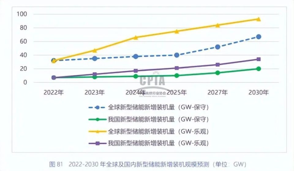 據(jù)中國(guó)光伏行業(yè)協(xié)會(huì)(CPIA)的統(tǒng)計(jì),2022年全球及國(guó)內(nèi)新型儲(chǔ)能新增裝機(jī)約為32GW、7GW,創(chuàng)歷史新高。隨著政策執(zhí)行、成本下降和技術(shù)改進(jìn),新型儲(chǔ)能將更能滿足發(fā)電側(cè)、電網(wǎng)側(cè)、用戶側(cè)的電力儲(chǔ)能需求。預(yù)計(jì)2025年,全球及我國(guó)新型儲(chǔ)能年度新增裝機(jī)或分別超過(guò)40GW、10GW,有望達(dá)到75GW、21GW。