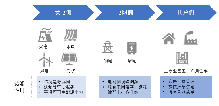 從整個(gè)電力系統(tǒng)的角度看,儲(chǔ)能的應(yīng)用場(chǎng)景可分為發(fā)電側(cè)儲(chǔ)能、電網(wǎng)側(cè)儲(chǔ)能和用戶側(cè)儲(chǔ)能三大場(chǎng)景。其中,發(fā)電側(cè)對(duì)儲(chǔ)能的需求場(chǎng)景類(lèi)型較多,包括可再生能源并網(wǎng)、電力調(diào)峰、系統(tǒng)調(diào)頻等;電網(wǎng)側(cè)儲(chǔ)能主要發(fā)揮支撐電力保供、提升系統(tǒng)調(diào)節(jié)能力、支撐新能源高比例外送以及替代輸配電工程投資等作用;用戶側(cè)儲(chǔ)能主要用于電力自發(fā)自用、峰谷價(jià)差套利、容量電費(fèi)管理和提高供電可靠性等。然而,在實(shí)際應(yīng)用中,儲(chǔ)能的某一功能應(yīng)用并不局限于單一應(yīng)用場(chǎng)景,以平滑輸出、跟蹤出力計(jì)劃為例,可同時(shí)應(yīng)用于發(fā)電側(cè)、電網(wǎng)側(cè)和用戶側(cè)。