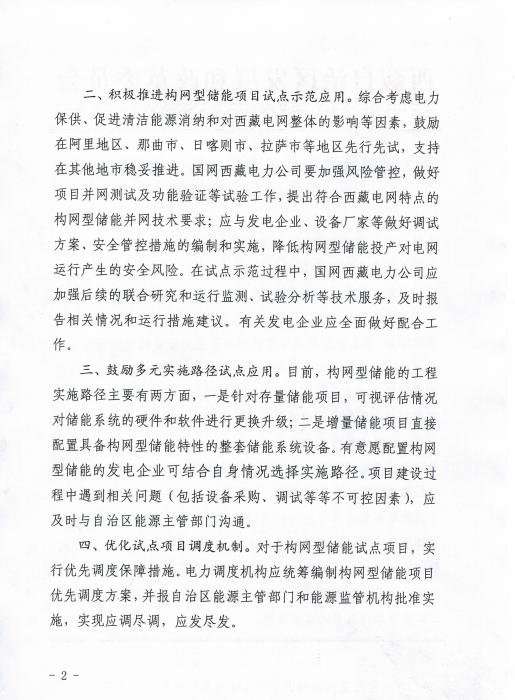 積極推進(jìn)構(gòu)網(wǎng)型儲能項目試點(diǎn)示范應(yīng)用。綜合考慮電力保供、促進(jìn)清潔能源消納和對西藏電網(wǎng)整體的影響等因素,鼓勵在阿里地區(qū)、那曲市、日喀則市、拉薩市等地區(qū)先行先試,支持在其他地市穩(wěn)妥推進(jìn)。國網(wǎng)西藏電力公司要加強(qiáng)風(fēng)險管控,做好項目并網(wǎng)測試及功能驗證等試驗工作,提出符合西藏電網(wǎng)特點(diǎn)的構(gòu)網(wǎng)型儲能并網(wǎng)技術(shù)要求;應(yīng)與發(fā)電企業(yè)、設(shè)備廠家等做好調(diào)試方案、安全管控措施的編制和實施,降低構(gòu)網(wǎng)型儲能投產(chǎn)對電網(wǎng)運(yùn)行產(chǎn)生的安全風(fēng)險。