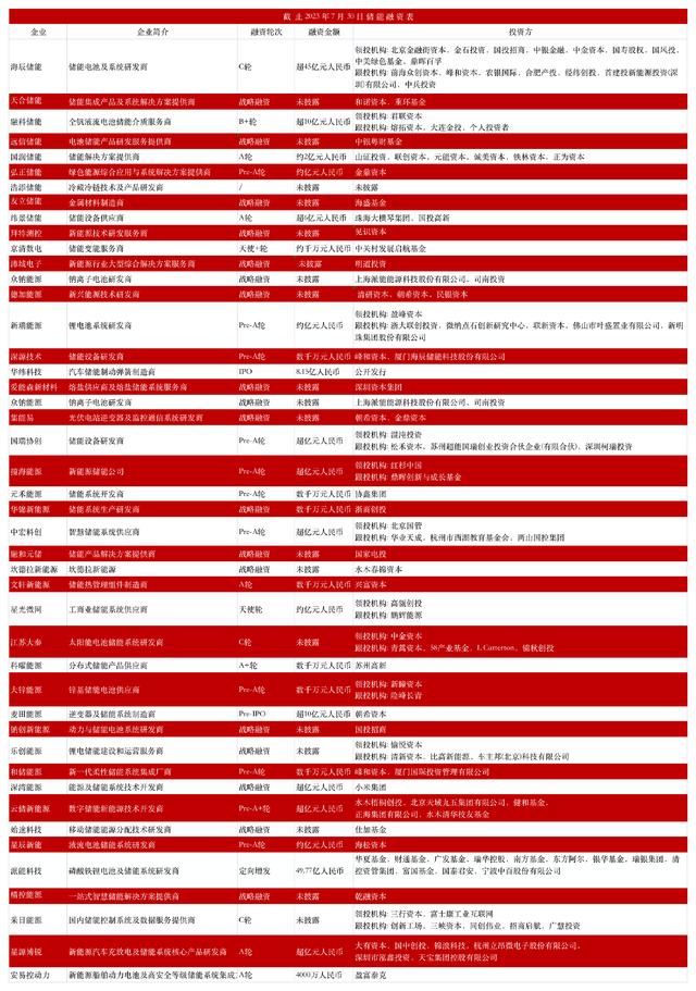 7月5日,海辰儲(chǔ)能完成45億元C輪融資;4月17日,融科儲(chǔ)能完成超10億元B+輪融資;3月20日,星源博瑞A輪融資數(shù)億源、大鋅能源完成pre-A輪融資數(shù)千萬(wàn)元、華錦新能源完成天使輪融資數(shù)千萬(wàn)元;3月28日,精控能源完成C輪數(shù)億元融資;3月18日,緯景儲(chǔ)能完成超6億元A輪融資等等。其中儲(chǔ)能戰(zhàn)略融資事件最多達(dá)23起,其次是A輪融資共18起。