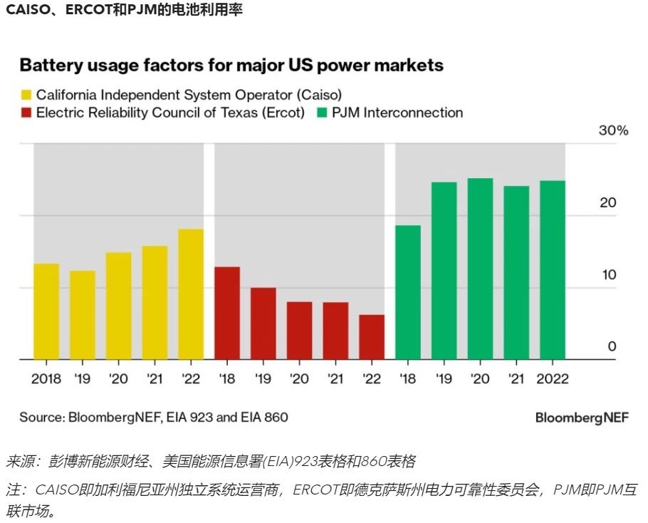 電池利用率受電池使用情況影響,也因地區(qū)而異。對于加利福尼亞州獨立系統(tǒng)運營商(CAISO),由于市場多元化的商業(yè)模式,利用率波動很大;而在德克薩斯州,對于電力可靠性委員會(ERCOT),電池主要提供調頻服務,因此電池平均利用率較低;在PJM互聯(lián)市場中,電池也主要用于調頻,但由于市場對電池的循環(huán)需求高,利用率往往相當之高。
