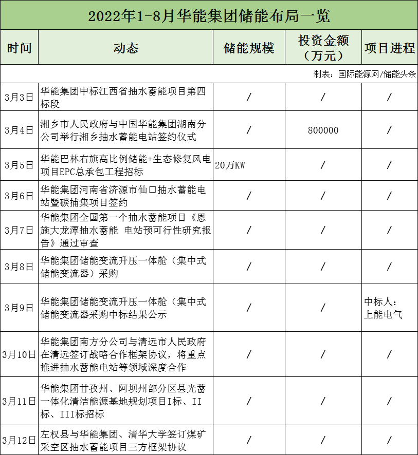 2022年,華能集團(tuán)全國第一個(gè)抽水蓄能項(xiàng)目《恩施大龍?zhí)冻樗钅茈娬绢A(yù)可行性研究報(bào)告》通過審查;與湘鄉(xiāng)市、左權(quán)縣等地簽訂抽水蓄能項(xiàng)目合作協(xié)議,儲(chǔ)能項(xiàng)目招標(biāo)4個(gè),涉及儲(chǔ)能變流器、光蓄一體化等方面。