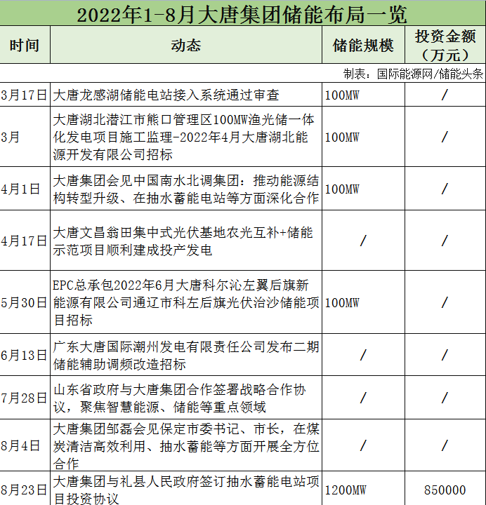 據(jù)不完全統(tǒng)計(jì),2022年1-8月,大唐集團(tuán)儲(chǔ)能項(xiàng)目招標(biāo)3個(gè),與山東、保定、南水北調(diào)集團(tuán)等簽訂合作協(xié)議,涉及抽水蓄能、智慧能源等領(lǐng)域。