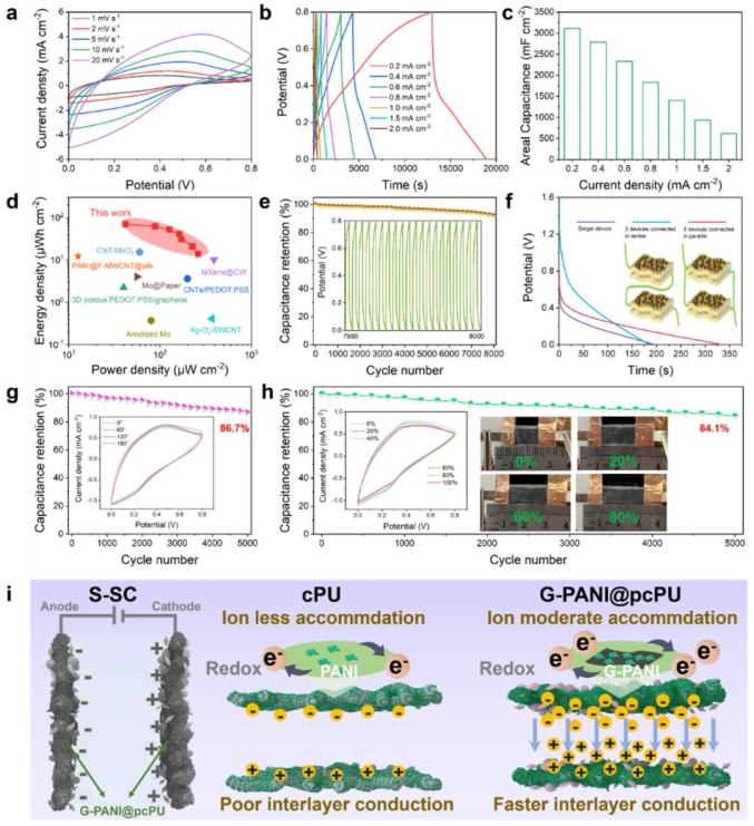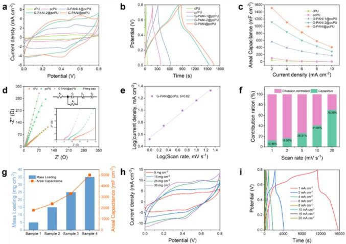 根據(jù)恒流充放電(GCD)曲線計(jì)算得出G-PANI@pcPU的最高面積比電容為1,512.5 mF cm−2(圖4c)。提高G-PANI在電極上負(fù)載量能有效提高電極的能量存儲,面積比電容可達(dá)到5,093.7 mF cm−2(圖4g-i)。