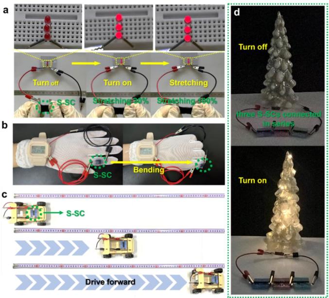 綜上所述,G-PANI@pcPU電極具有相互連接的多孔骨架、開放的離子遷移/插層通道、高機(jī)械柔性和大規(guī)模制備等優(yōu)勢。在三電極系統(tǒng)中表現(xiàn)出超大的面積電容與贗電容可調(diào)性能。構(gòu)筑的G-PANI@pcPU可拉伸超級電容器(S-SCs)具有高能量密度、大比電容和優(yōu)異的可拉伸循環(huán)穩(wěn)定性,并實(shí)現(xiàn)了在高拉伸形變條件下為電子器件穩(wěn)定供電的應(yīng)用。