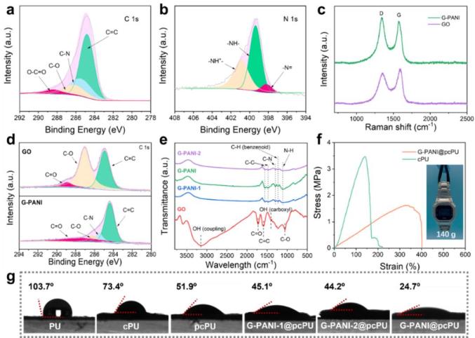 圖3 G-PANI@pcPU織物的(a-e)結(jié)構(gòu)表征、(f)可拉伸性能和(g)表面接觸角