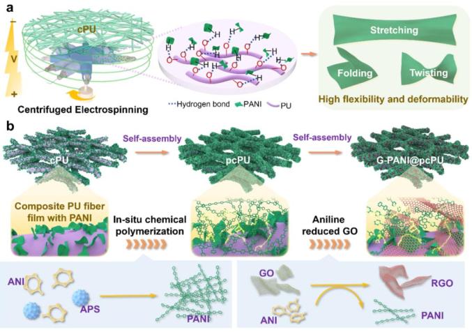 隨后,cPU織物經(jīng)過原位聚合聚苯胺和苯胺還原氧化石墨烯(GO)的兩次自組裝反應(yīng),逐步構(gòu)建成G-PANI@pcPU織物(圖1)。