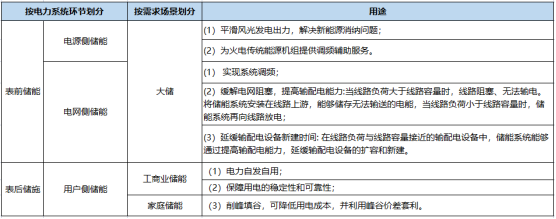 目前,儲能技術(shù)主要應(yīng)用于電力系統(tǒng)。具體而言,可以將儲能技術(shù)在電力系統(tǒng)中的典型應(yīng)用場景劃分為電源側(cè)、電網(wǎng)側(cè)和用戶側(cè)三個(gè)方面。其中電源側(cè)、電網(wǎng)側(cè)儲能又稱為表前儲能或大儲,用戶側(cè)儲能又稱為表后儲能。用戶側(cè)儲能分為工商業(yè)儲能與戶儲,兩者區(qū)別在于客戶群體。