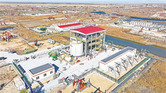 遼河油田電熱熔鹽儲能注汽試驗站:世界首座電熱熔鹽儲能注汽試驗站。目前常見的熔鹽儲能方式是把光熱或谷電、綠電轉(zhuǎn)化為熱能儲存在熔鹽中,再通過全天連續(xù)釋放熱能與純凈水換熱產(chǎn)生過熱蒸汽用于發(fā)電。該試驗站通過獨創(chuàng)的蒸汽發(fā)生系統(tǒng),將油田開采過程中產(chǎn)生的污水凈化軟化后與高溫熔鹽換熱,產(chǎn)生的濕飽和蒸汽直接用于油田生產(chǎn),可有效減少能量轉(zhuǎn)換過程中的消耗。該試驗站每年可生產(chǎn)蒸汽4.8萬噸,替代天然氣313萬立方米,減排二氧化碳6768噸。(羅前彬 整理)