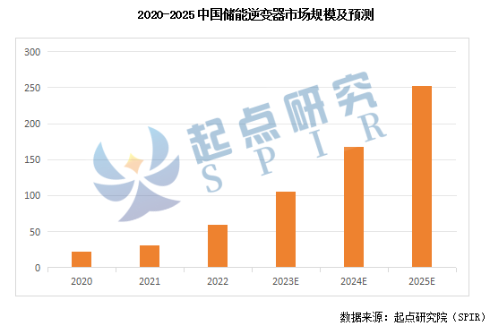 近年來(lái),我國(guó)儲(chǔ)能市場(chǎng)呈現(xiàn)出高速增長(zhǎng)態(tài)勢(shì)(國(guó)家能源局?jǐn)?shù)據(jù),2023年上半年國(guó)內(nèi)新型儲(chǔ)能新增裝機(jī)8.63GW/17.72GWh,接近歷年累計(jì)裝機(jī)總和),催生對(duì)于儲(chǔ)能逆變器的巨大需求,儲(chǔ)能逆變器市場(chǎng)前景廣闊。據(jù)起點(diǎn)研究院(SPIR)數(shù)據(jù)和預(yù)測(cè),2022年中國(guó)儲(chǔ)能逆變器市場(chǎng)規(guī)模達(dá)60億元,2023年將達(dá)105億元,同比增速達(dá)75%,預(yù)測(cè)到2025年達(dá)252億。