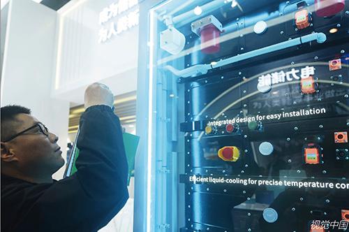 2024年3月11日,杭州,觀眾在中國國際儲(chǔ)能大會(huì)參觀億緯鋰能的液冷儲(chǔ)能設(shè)施。