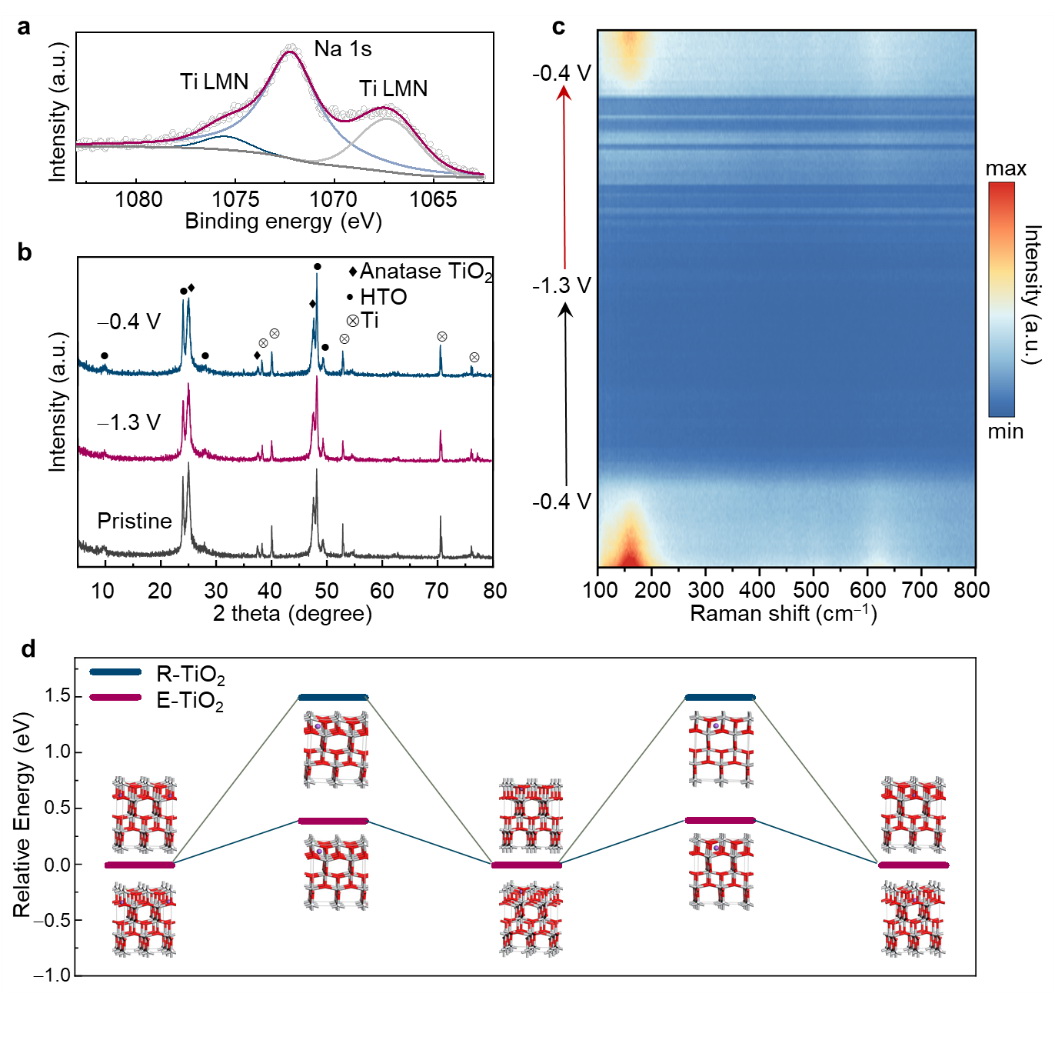 圖4:E-TiO2的鈉離子嵌入行為分析。(a)鈉離子嵌入后的XPS分析;(b)非原位XRD;(c)原位拉曼;(d)擴散路徑與擴散能壘。