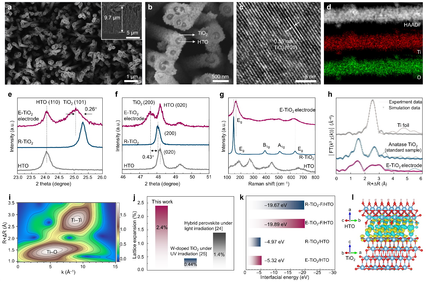 (h)Ti K-edge的FT-EXAFS圖譜;(i)WT-EXAFS譜;j)與文獻中的晶格膨脹數(shù)值及方法對比;(k)界面能分析;(l)E-TiO2-F/HTO界面電荷密度差分析。