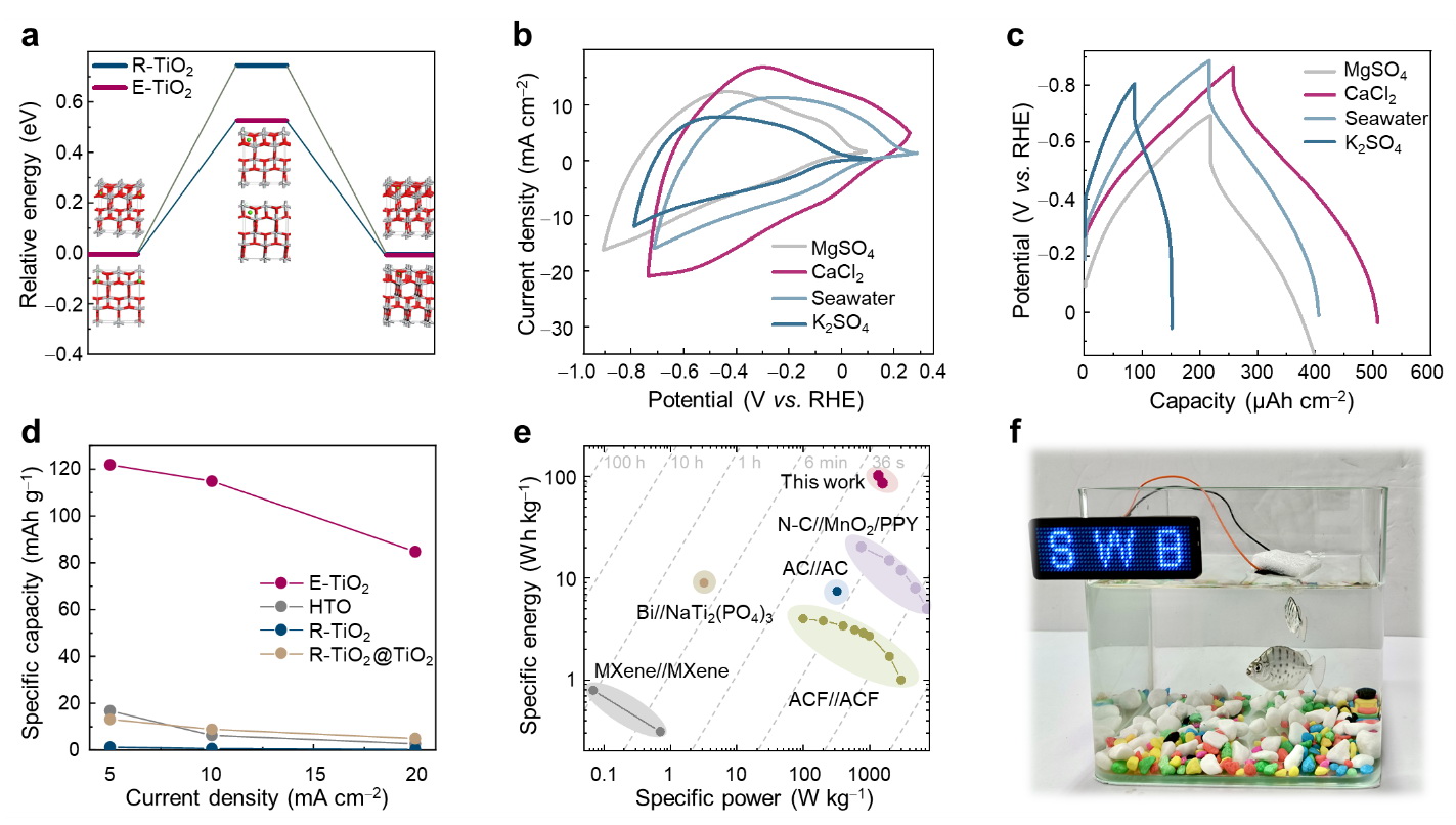 要點5:圖5a的DFT計算表明,E-TiO2同樣可以降低其他陽離子的擴散勢壘(例如Ca2+)。通過CV和GCD(圖5b,c)可知,E-TiO2在其他電解液中也具有類似于儲鈉時的贗電容主導特性。當電流密度為10mA/cm2時,E-TiO2儲存Ca2+和Mg2+的面容量分別為247和182 μAh/cm2,接近Na+的容量(259 μAh/cm2)。直接使用天然海水作為電解液,構(gòu)建了以E-TiO2為負極材料,電催化劑為正極的海水二次電池。在5 mA/cm2的電流密度下,E-TiO2的比容量為152 mAh/g(圖5d)?;谡摌O活性物質(zhì)的質(zhì)量,新型海水電池的比能量/功率密度優(yōu)于當前報道的可充放海水儲能器件、水系鈉鉀及鎂鈣離子電池(圖5e)。團隊對二次海水電池的原型也進行了展示(圖5f)。