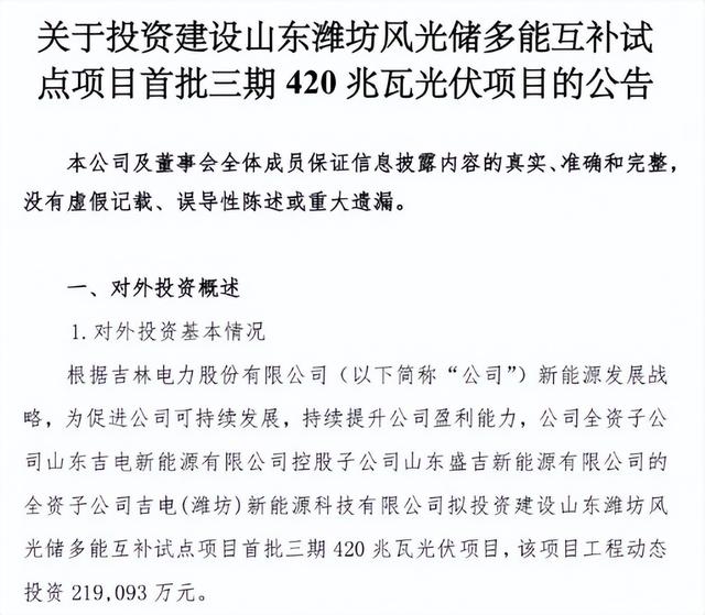 公告表示,公司全資子公司山東吉電新能源有限公司控股子公司山東盛吉新能源有限公司的全資子公司吉電(濰坊)新能源科技有限公司擬投資建設(shè)山東濰坊風(fēng)光儲(chǔ)多能互補(bǔ)試點(diǎn)項(xiàng)目首批三期420兆瓦光伏項(xiàng)目,該項(xiàng)目工程動(dòng)態(tài)投資219,093萬(wàn)元。