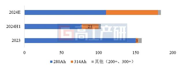 2023年下半年以來,企業(yè)加速切換314Ah產(chǎn)線,部分企業(yè)已將280Ah作為庫(kù)存拋售。截至2024年上半年,314Ah有效產(chǎn)能已達(dá)40GWh。