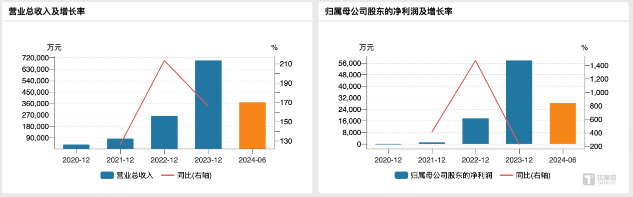業(yè)績(jī)是最好的佐證。2021年-2023年,海博思創(chuàng)分別實(shí)現(xiàn)營(yíng)收8.38億元、26.26億元、69.82億元,同比增長(zhǎng)126.25%、213.40%、165.89%;歸母凈利潤(rùn)1126.05萬(wàn)元、1.77億元和5.78億元,同比增長(zhǎng)413.46%、1474.23%和226.13%。今年上半年,公司營(yíng)收、歸母凈利潤(rùn)再錄得36.87億元和2.82億元。