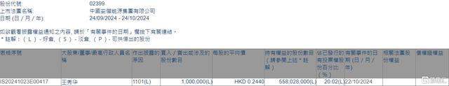 根據(jù)聯(lián)交所最新權(quán)益披露資料顯示,2024年10月22日,中國(guó)安儲(chǔ)能源(02399.HK)獲股東王秀華在場(chǎng)內(nèi)以每股均價(jià)0.244港元增持100萬(wàn)股,涉資約24.4萬(wàn)港元。