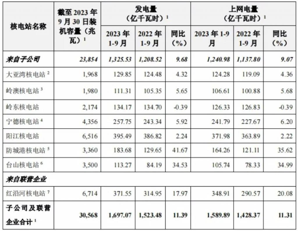 中國(guó)廣核是目前國(guó)內(nèi)最大的核電公司,目前尚未發(fā)布 2023 年年報(bào),以 2023 年三季報(bào)數(shù)據(jù)來看,截至 2023 年 9 月 30 日,中國(guó)廣核總發(fā)電量為 1697.07 億千瓦時(shí),平均到每季度,算上其 11.39% 左右的增幅,2023 年全年發(fā)電量最高不超過 2300 億千瓦時(shí)。