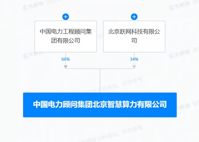 股權穿透顯示,該公司由中國能建旗下中國電力工程顧問集團有限公司和北京躍網科技有限公司共同持股。