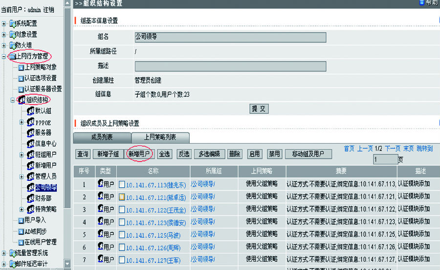 內(nèi)網(wǎng)管理一般通過路由模式或橋接模式將硬件連接到網(wǎng)絡(luò)出口,并通過內(nèi)網(wǎng)管理系統(tǒng)進行網(wǎng)絡(luò)監(jiān)控。首先要通過內(nèi)網(wǎng)管理系統(tǒng)將上網(wǎng)賬戶規(guī)劃到不同的組織結(jié)構(gòu),針對不同組織結(jié)構(gòu)進行策略配置。如圖1、圖2、圖3所示。