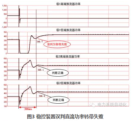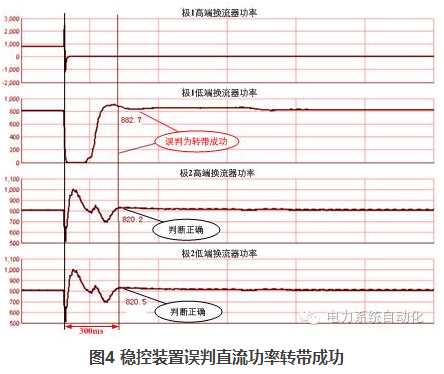 直流故障前后總損失的功率是穩(wěn)控系統(tǒng)執(zhí)行控制策略的重要依據(jù)。直流故障暫態(tài)過程復(fù)雜,若由穩(wěn)控裝置計(jì)算事故前功率與事故后的穩(wěn)態(tài)功率差,事故前后的時間窗口Δt難以確定。實(shí)踐表明:Δt過短(最初設(shè)計(jì)為30ms),可能會誤判健全換流器的轉(zhuǎn)帶;而延長Δt,即便是增加至300ms,在某些運(yùn)行工況下,仍然會出現(xiàn)誤判為轉(zhuǎn)帶失?。ㄈ鐖D3)或誤判為轉(zhuǎn)帶成功(如圖4)的情況。經(jīng)過大量實(shí)驗(yàn)數(shù)據(jù)分析,若要確保在所有故障工況下裝置均不會誤判,則Δt至少需延長至500ms以上,無法滿足電網(wǎng)的穩(wěn)定控制需求。