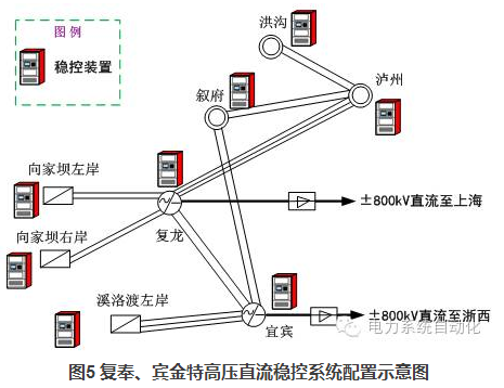 隨著多個特高壓交直流輸電通道的建成投產(chǎn),控制策略的設(shè)計(jì)和制定面臨新的要求,尤其體現(xiàn)在多個穩(wěn)控系統(tǒng)和控制策略間的協(xié)調(diào)控制方面。以復(fù)奉直流、賓金直流為例,為了解決兩大特高壓直流送出的穩(wěn)定問題,在復(fù)龍換流站、宜賓換流站、溪洛渡電廠等8個廠站配置了安全穩(wěn)定控制裝置,如圖5所示。經(jīng)計(jì)算,兩大直流故障后均可能會切除向左、向右以及溪左三個電廠的機(jī)組,兩個穩(wěn)控系統(tǒng)之間的控制措施有重疊。若按傳統(tǒng)的思路制定策略和實(shí)施方案,兩套穩(wěn)控系統(tǒng)間無信息交互和協(xié)調(diào),當(dāng)出現(xiàn)兩大直流同時雙極閉鎖的極端故障時,某些機(jī)組會同時被兩個主站發(fā)來的命令切除,從而導(dǎo)致控制措施量不足。