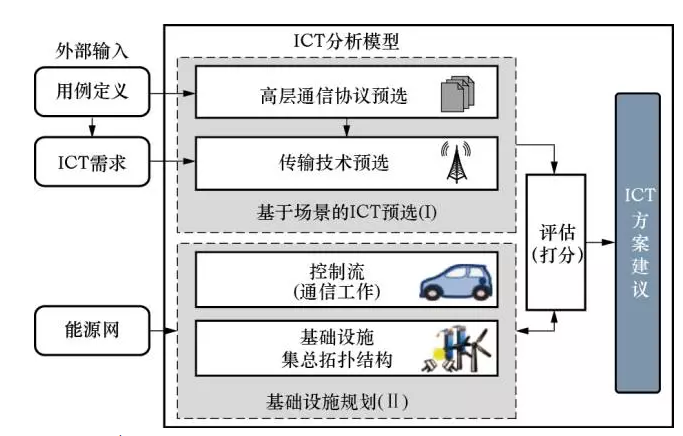 對ICT的研究是個較為前沿的課題。文獻(xiàn)[10]提出了一種應(yīng)用于智能配電網(wǎng)規(guī)劃的ICT模型,如圖3所示。此模型主要分為兩部分:基于場景的預(yù)選和基礎(chǔ)設(shè)施規(guī)劃。首先,不考慮網(wǎng)絡(luò)和基礎(chǔ)設(shè)施的具體情況進(jìn)行預(yù)選,生成ICT技術(shù)方案通用集合和高層協(xié)議;其次,針對具體的能源網(wǎng)進(jìn)行基礎(chǔ)設(shè)施規(guī)劃,確定若干ICT技術(shù)方案;這兩部分均依賴于由規(guī)劃人員提供的外部數(shù)據(jù),例如所定義的用例和對ICT的各種需求。最后,對兩部分的輸出進(jìn)行成本效益分析,針對給定的外部數(shù)據(jù)確定合適的ICT技術(shù)方案。正如文獻(xiàn)[10]所指出的,對ICT進(jìn)行合理規(guī)劃可以避免使用擴(kuò)建電網(wǎng)的傳統(tǒng)手段,延緩電網(wǎng)的一次投資。