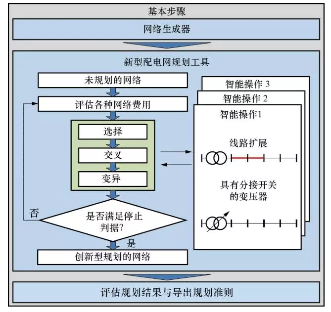 文獻(xiàn)[18]針對中、低壓配網(wǎng)提出一種基于遺傳算法(geneticalgorithm,GA)的規(guī)劃方法,如圖6所示。第一步,根據(jù)不同的供用電要求以及實際電網(wǎng)特征,生成特征各異的網(wǎng)絡(luò)結(jié)構(gòu);第二步,利用GA方法針對每種網(wǎng)絡(luò)結(jié)構(gòu)得到最優(yōu)的傳統(tǒng)建設(shè)方案和智能建設(shè)方案;最后,對所得方案進(jìn)行評估比較。運用GA算法時,每種符合運行約束要求的電網(wǎng)配置方案都作為一個個體,每次迭代時,以各種網(wǎng)絡(luò)成本(適應(yīng)度函數(shù))最小為目標(biāo),先隨機(jī)挑選兩個個體進(jìn)行交叉生成新個體,然后以減小成本為原則修改個體(變異),變異后計算潮流以驗證網(wǎng)絡(luò)約束是否越限,如果越限,則通過擴(kuò)建線路等措施修改個體,或回退到變異之前的初始狀態(tài);此過程不斷繼續(xù),直到滿足收斂判據(jù)。另外,該方法還采用了所謂智能操作(smartoperator)來改善GA求解效率不高的缺陷,即利用一些有效措施(如中低壓變壓器分接頭切換和線路擴(kuò)建相結(jié)合)對當(dāng)前結(jié)果進(jìn)行智能化修正,加速找到最優(yōu)解的過程。