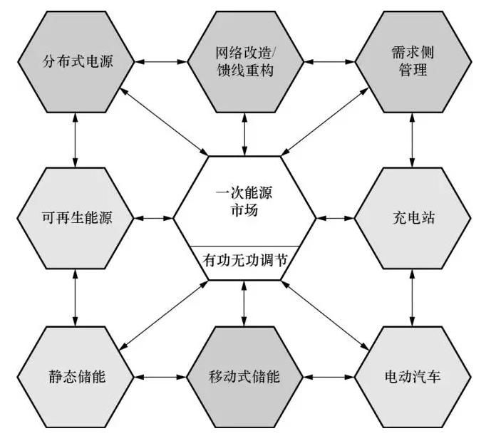 為了輔助智能電網(wǎng)規(guī)劃人員確保系統(tǒng)運行的安全性,可靠性以及供電質(zhì)量,需要開發(fā)綜合全面的新工具。文獻(xiàn)[16]通過對智能技術(shù)及其交互方式進(jìn)行分類,設(shè)計了一個專為智能電網(wǎng)規(guī)劃人員量身定做的工具箱架構(gòu)(如圖5所示)。規(guī)劃人員在確定電網(wǎng)建設(shè)和饋線重構(gòu)方案時,并非像傳統(tǒng)做法那樣只考慮峰荷,而是同時考慮分布式電源(DG)、移動式存儲和需求側(cè)管理(DSM),這樣得到的方案更具成本效益。通過可再生能源和靜態(tài)儲能相互配合可以削峰填谷,增加網(wǎng)絡(luò)容量;充電站的電動汽車耗電量受實時電價變化的影響,因此可作為DSM的一部分;各類儲能設(shè)備可被用來提升電能質(zhì)量,因此可被視為有功/無功功率源;一次能源市場運行人員在擁有發(fā)電和儲能資源的輸配電運行人員之間進(jìn)行協(xié)調(diào)優(yōu)化,得到實時電價,通過AMI提供給用戶。此工具箱的理念和結(jié)構(gòu)尚未成熟,還需在未來的研究工作中進(jìn)一步完善。