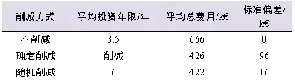由于規(guī)劃周期較長,考慮了未來峰荷發(fā)展和DG接入容量的變電站規(guī)劃面臨很大的不確定性和投資風(fēng)險,所以必須進(jìn)行風(fēng)險評估。文獻(xiàn)[7]在相同功率約束條件下,對投資變電站和削減配電側(cè)DG發(fā)電出力兩種技術(shù)方案進(jìn)行了比較,給出了優(yōu)化的折中方法。該文獻(xiàn)以30MW變電站接入不同光伏容量(0、1、9.5MW)的情形為例,對各種削減模式下延緩?fù)顿Y的效果進(jìn)行了比較,結(jié)果如表2所示,與不削減DG容量相比,采用確定(定時)削減方式,投資年限可延緩3.4年,投資費用可減少9.6萬歐元;采用隨機(jī)削減方式,投資年限則可延緩2.5年、投資費用可減少1.6萬歐元。因為實際參數(shù)的隨機(jī)特性會影響計算結(jié)果,所以真正的延緩?fù)顿Y效果主要取決于預(yù)測模型的精度。