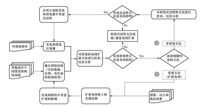 目前,法國配電公司(ERDF)正在研究如何利用發(fā)電側(cè)和需求側(cè)的靈活性來緩解電壓、線路傳輸容量的限制,從而避免/延緩電網(wǎng)擴(kuò)建的問題,文獻(xiàn)[13]就此給出了一個通用框架(如圖4所示),對常規(guī)的電網(wǎng)擴(kuò)建方法和利用電網(wǎng)靈活性的方法進(jìn)行技術(shù)、經(jīng)濟(jì)比較,選擇成本效益最高的作為最終方案。發(fā)電、用電資源的靈活性是從容量、持續(xù)時間和頻率等幾方面來定義的,而這不僅需要負(fù)荷持續(xù)時間曲線,還需要隨機(jī)時序負(fù)荷曲線,其預(yù)測方法也是ERDF目前正致力于研究的一個領(lǐng)域。在進(jìn)行技術(shù)、經(jīng)濟(jì)比較時,主要是比較采用某方案所需要的成本和該方案能夠減少電量不足期望值(ExpectedEnergyNotSupplied,EENS)所帶來的收益,如果前者小于后者,則該方案是具有成本效益的。另外,文獻(xiàn)[13]認(rèn)為,雖然在有些情況下利用電網(wǎng)靈活性可能很難達(dá)到電網(wǎng)擴(kuò)建后高可靠、高質(zhì)量的供電,但是如果能夠獲得較好的成本效益,利用電網(wǎng)靈活性來推遲電網(wǎng)擴(kuò)建也是合理的。